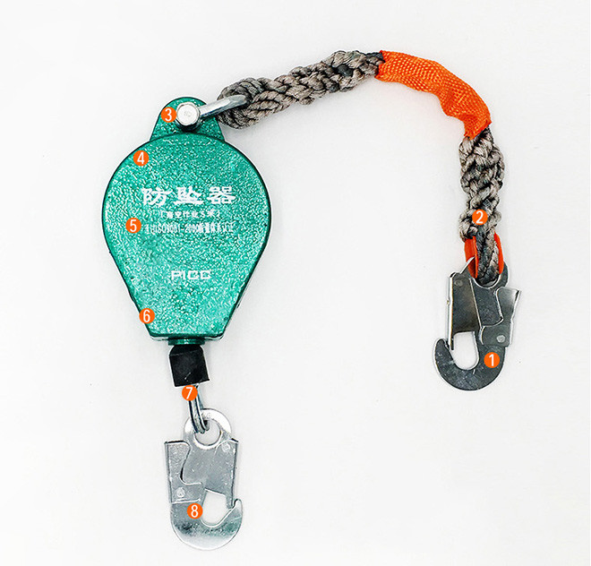 防墜器防撞橡膠墊,防滑頭,耐磨損,減少鎖扣處迅速回彈對殼體的傷害;速差防墜器新型自鎖式掛鉤設計,為您進一步提升安全保障;除此之外防墜器安全繩選用航空級鋼絲繩,安全耐用不易生銹;吊鉤與吊繩接觸位置安裝有硬質工業塑料防護套,其作用是減少吊鉤與纖維吊繩之間接觸從而減少磨損,提高吊繩使用壽命;